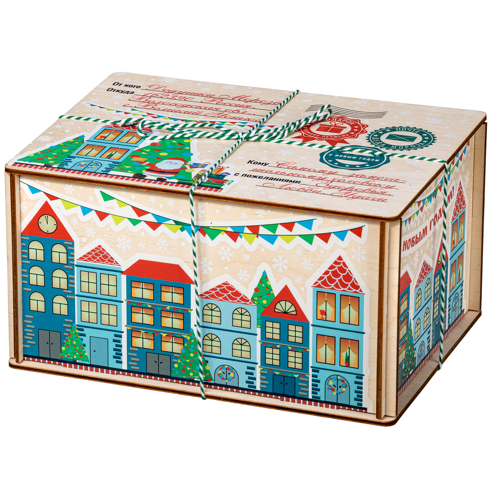 Подробнее о доставкеПрекрасный подарок с почтовой символикой – «Новогодний городок». Это деревянная коробочка размером 21*11*14. В которой находится кондитерский набор весом 1000 граммов. Только самые свежие и вкусные кондитерские изделия: шоколадные конфеты, печенье, десерты, вафли и многое другое. На подарке изображен новогодний городок, который украшен нарядными ёлками, разноцветными флажками и гирляндами. Подарок перевязан веревочкой, которая обеспечивает сохранность подарка. В дальнейшем эту удивительную коробочку можно использовать для хранения разных мелочей.